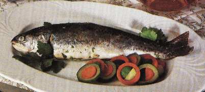 | Preparazione: | Mettete nella pesciera o in un tegame 1 bicchiere d'acqua e di vino. Unite le erbe aromatiche compresa la cipolla (lavate e lasciate intere) e un pò di sale grosso. Fate bollire e aggiungete la trota pulita e lavata. Fate cuocere per 6 minuti calcolati da quando bolle l'acqua. Togliete il pesce. E' pronto, aprite delicatamente la trota, togliete la spina e condite con poco sale, pepe, olio e succo di limone, quindi servite. E' un piatto sano, nutriente e leggero. Si può anche condire con maionese o salsa Aurora. | |